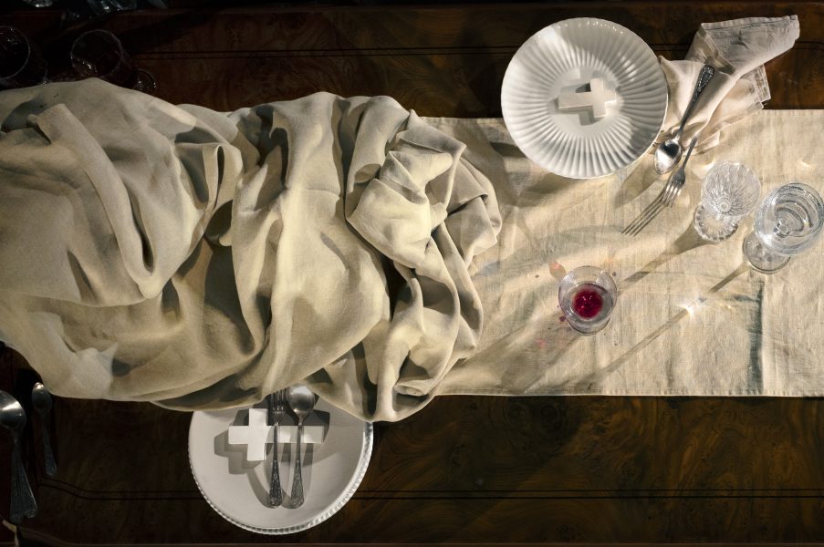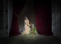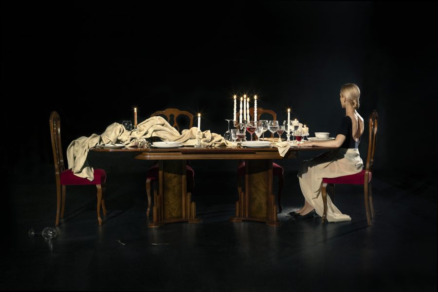 Las Eurídices de Crashroom nos hablan desde el espacio austero, concentrado en reforzar la “puesta en abismo” con puertas abiertas, arcos, marcos; y espejos. Un escenario coral y como siempre en la obra de Rocío de gran fuerza simbólica o, esta vez, metasimbólica, pues representa también la forma de violencia sutil definida por Bourdieu. La escena, deliberadamente suave y minimalista, deja clara la existencia de historias conectadas pero muy distintas, a la vez que exhala misterio, impenetrabilidad, como ese círculo de mármol negro en el suelo que podría ser el círculo de sal en negativo, el círculo mágico de protección contra el mal de ojo o las brujas de Salem, dentro del cual se sitúa también un hijo, él sí reflejado en un espejo.